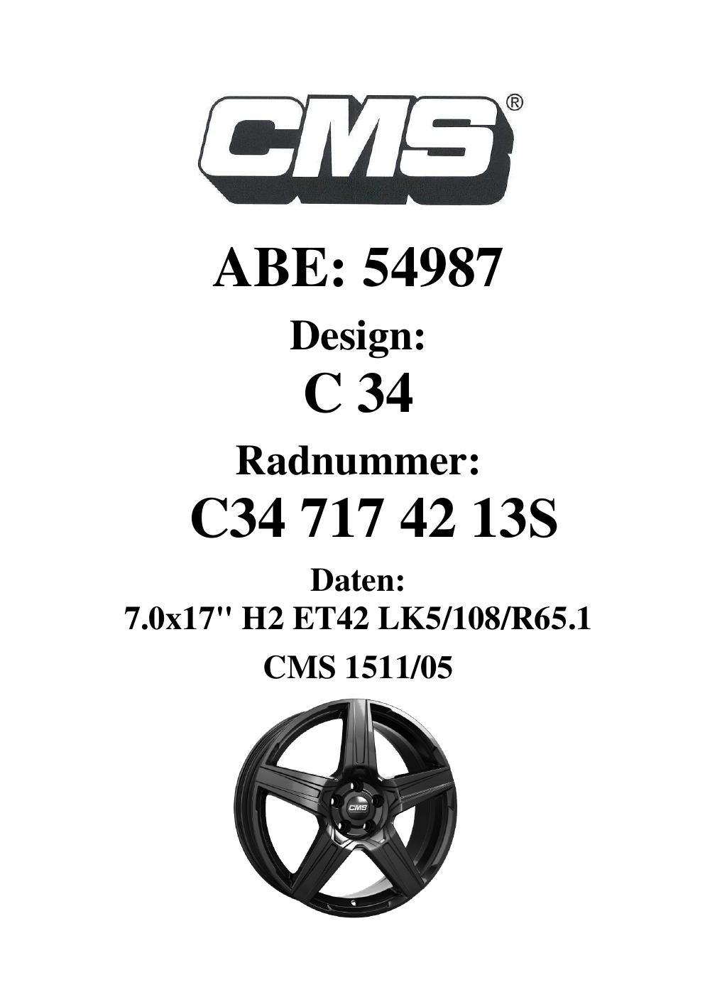 Dieses Gutachten (ABE) bezieht sich auf die Alufelge CMS C34 in der Ausführung 7Jx17 ET 0, Mittenloch 0 mm (KBA 54987). Im PDF findest du typischerweise zulässige Reifengrößen, Auflagen/Anbauhinweise und – je nach Dokument – Hinweise zur Eintragung.
