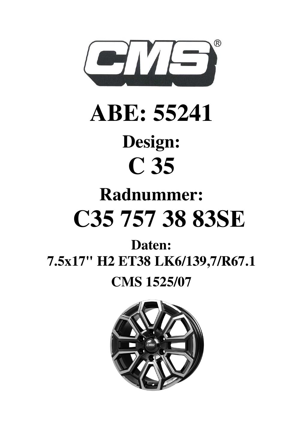 Dieses ABE gehört zur Felge CMS C35 in 7.5Jx17 ET0 mit KBA 55241. Die Seite ist dafür gedacht, dass du schnell prüfen kannst, ob KBA, Design und Größe zu deiner Felge passen und danach direkt das richtige PDF lädst.