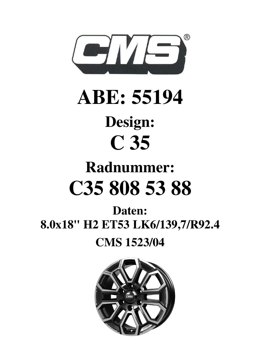 Dieses Gutachten (ABE) bezieht sich auf die Alufelge CMS C35 in der Ausführung 8Jx18 ET 0, Mittenloch 0 mm (KBA 55194). Im PDF findest du typischerweise zulässige Reifengrößen, Auflagen/Anbauhinweise und – je nach Dokument – Hinweise zur Eintragung.