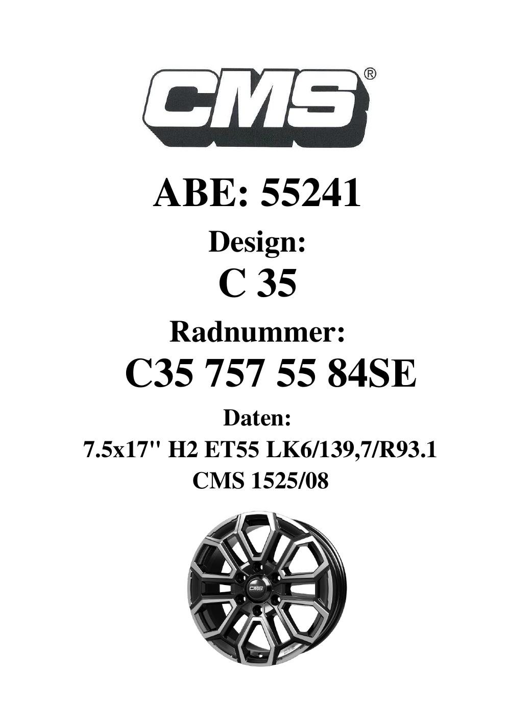 Dieses Gutachten (ABE) bezieht sich auf die Alufelge CMS C35 in der Ausführung 7.5Jx17 ET 0, Mittenloch 0 mm (KBA 55241). Im PDF findest du typischerweise zulässige Reifengrößen, Auflagen/Anbauhinweise und – je nach Dokument – Hinweise zur Eintragung.