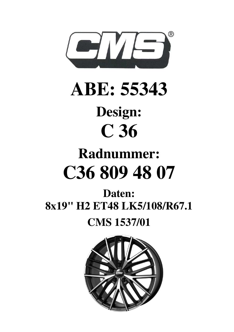 Dieses Gutachten (ABE) bezieht sich auf die Alufelge CMS C36 in der Ausführung 8Jx19 ET 0, Mittenloch 0 mm (KBA 55343). Im PDF findest du typischerweise zulässige Reifengrößen, Auflagen/Anbauhinweise und – je nach Dokument – Hinweise zur Eintragung.