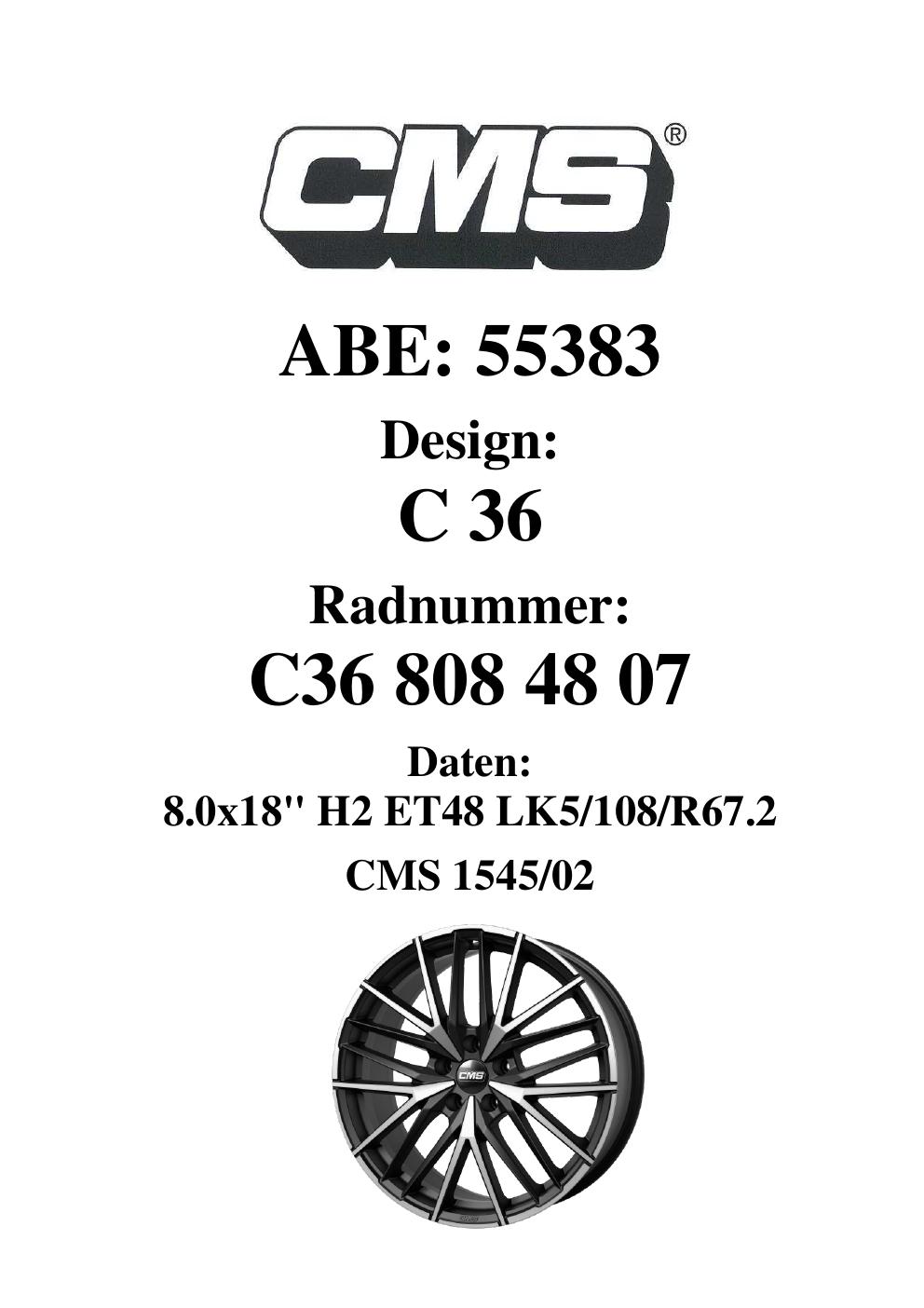 Dieses Gutachten (ABE) bezieht sich auf die Alufelge CMS C36 in der Ausführung 8Jx18 ET 0, Mittenloch 0 mm (KBA 55383). Im PDF findest du typischerweise zulässige Reifengrößen, Auflagen/Anbauhinweise und – je nach Dokument – Hinweise zur Eintragung.
