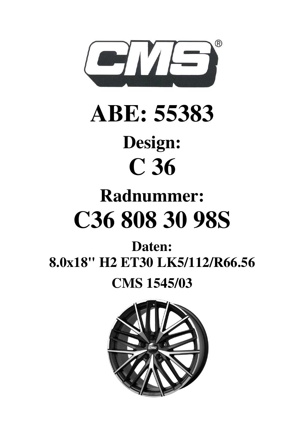 Dieses Gutachten (ABE) bezieht sich auf die Alufelge CMS C36 in der Ausführung 8Jx18 ET 0, Mittenloch 0 mm (KBA 55383). Im PDF findest du typischerweise zulässige Reifengrößen, Auflagen/Anbauhinweise und – je nach Dokument – Hinweise zur Eintragung.