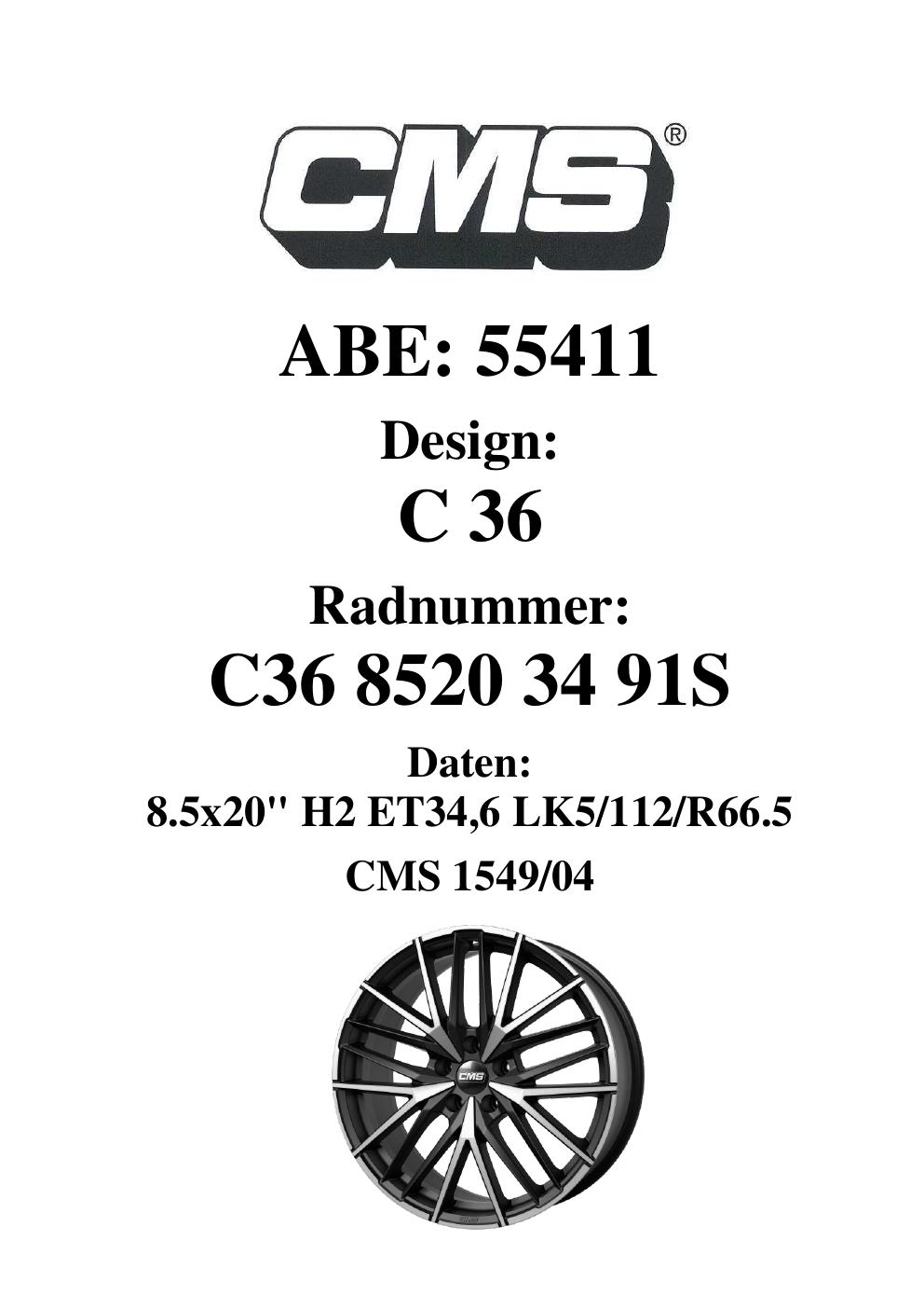 Dieses Gutachten (ABE) bezieht sich auf die Alufelge CMS C36 in der Ausführung 8.5Jx2 ET 0, Mittenloch 0 mm (KBA 55411). Im PDF findest du typischerweise zulässige Reifengrößen, Auflagen/Anbauhinweise und – je nach Dokument – Hinweise zur Eintragung.