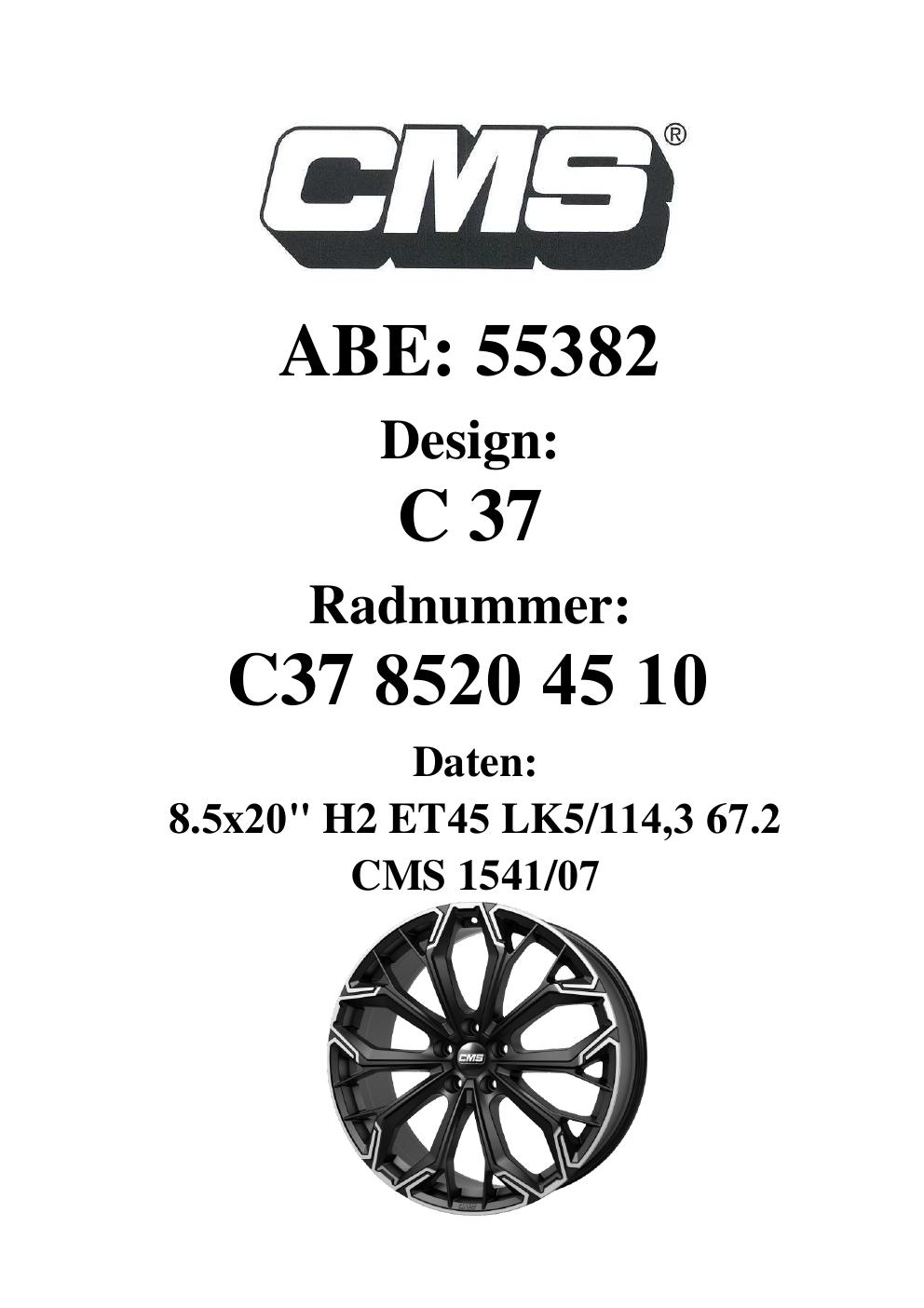 Dieses Gutachten (ABE) bezieht sich auf die Alufelge CMS C37 in der Ausführung 8.5Jx2 ET 0, Mittenloch 0 mm (KBA 55382). Im PDF findest du typischerweise zulässige Reifengrößen, Auflagen/Anbauhinweise und – je nach Dokument – Hinweise zur Eintragung.