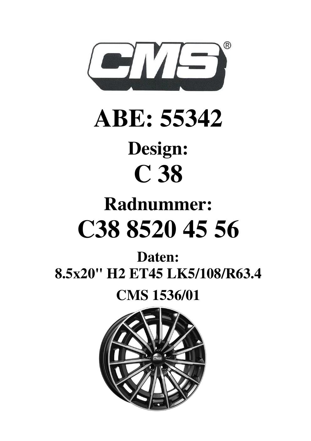 Dieses Gutachten (ABE) bezieht sich auf die Alufelge CMS C38 in der Ausführung 8.5Jx2 ET 0, Mittenloch 0 mm (KBA 55342). Im PDF findest du typischerweise zulässige Reifengrößen, Auflagen/Anbauhinweise und – je nach Dokument – Hinweise zur Eintragung.