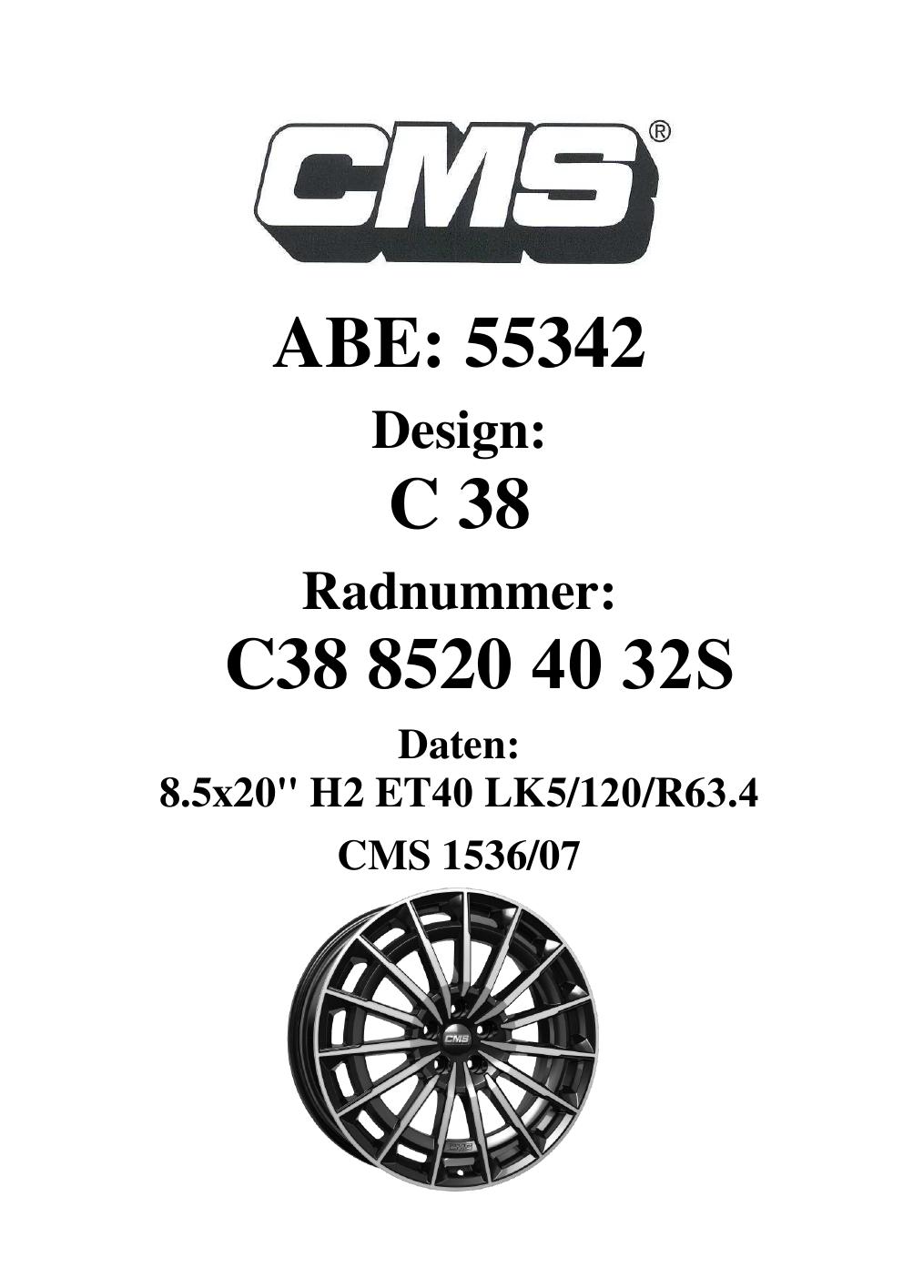 Dieses Gutachten (ABE) bezieht sich auf die Alufelge CMS C38 in der Ausführung 8.5Jx2 ET 0, Mittenloch 0 mm (KBA 55342). Im PDF findest du typischerweise zulässige Reifengrößen, Auflagen/Anbauhinweise und – je nach Dokument – Hinweise zur Eintragung.