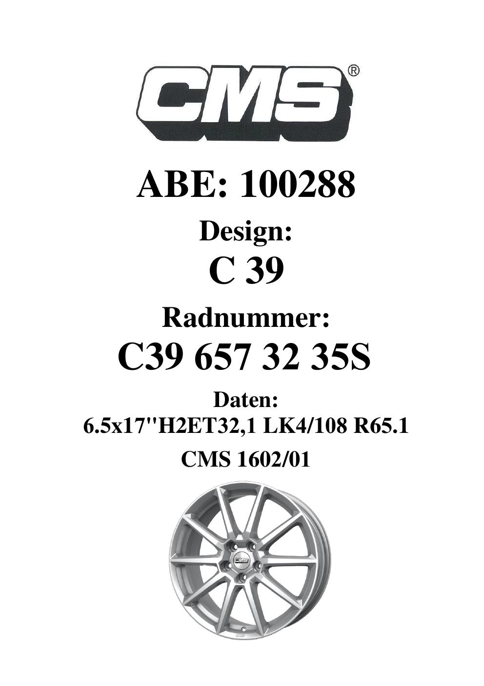 Dieses Gutachten (ABE) bezieht sich auf die Alufelge CMS C39 in der Ausführung 6.5Jx17 ET 0, Mittenloch 0 mm (KBA 100288). Im PDF findest du typischerweise zulässige Reifengrößen, Auflagen/Anbauhinweise und – je nach Dokument – Hinweise zur Eintragung.