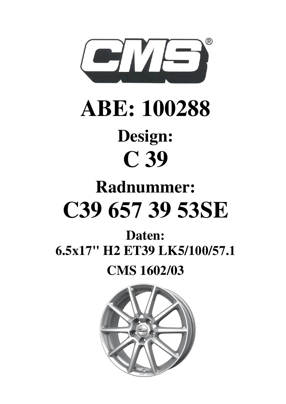 Dieses Gutachten (ABE) bezieht sich auf die Alufelge CMS C39 in der Ausführung 6.5Jx17 ET 0, Mittenloch 0 mm (KBA 100288). Im PDF findest du typischerweise zulässige Reifengrößen, Auflagen/Anbauhinweise und – je nach Dokument – Hinweise zur Eintragung.