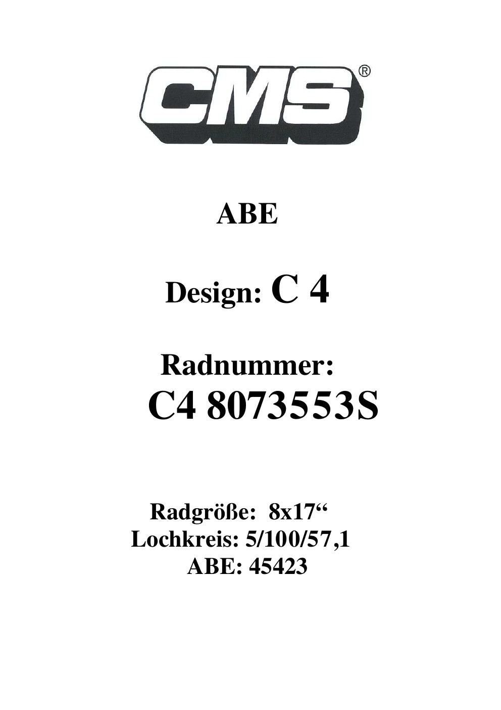 Dieses Gutachten (ABE) bezieht sich auf die Alufelge CMS C4 in der Ausführung ET 0, Mittenloch 0 mm (KBA 45423). Im PDF findest du typischerweise zulässige Reifengrößen, Auflagen/Anbauhinweise und – je nach Dokument – Hinweise zur Eintragung.