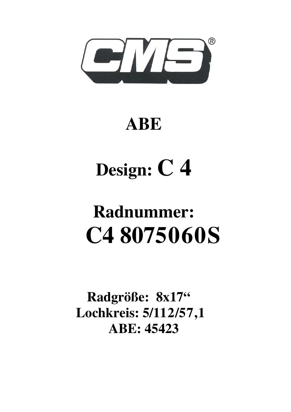 Dieses Gutachten (ABE) bezieht sich auf die Alufelge CMS C4 in der Ausführung ET 0, Mittenloch 0 mm (KBA 45423). Im PDF findest du typischerweise zulässige Reifengrößen, Auflagen/Anbauhinweise und – je nach Dokument – Hinweise zur Eintragung.