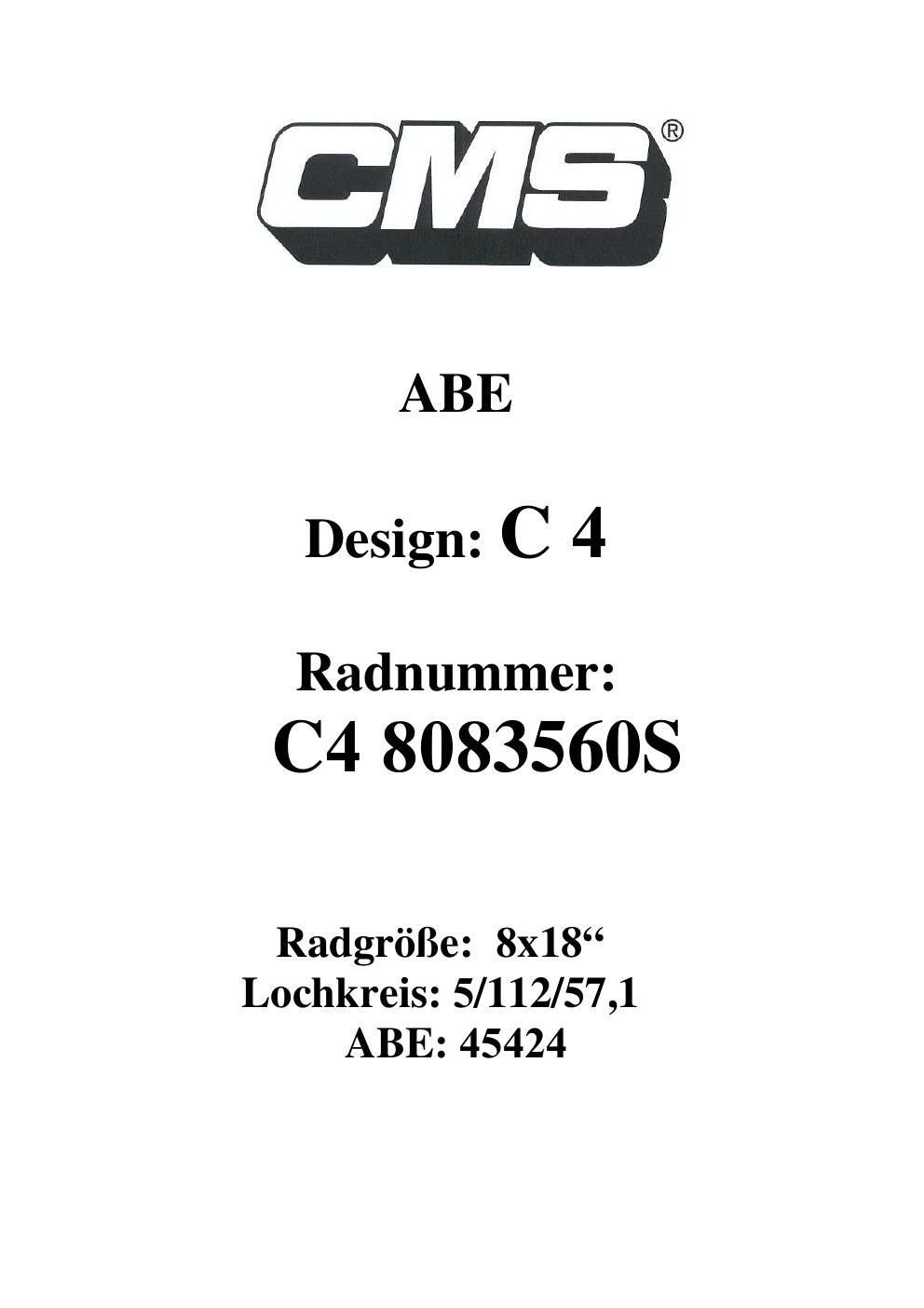 Dieses Gutachten (ABE) bezieht sich auf die Alufelge CMS C4 in der Ausführung ET 0, Mittenloch 0 mm (KBA 45424). Im PDF findest du typischerweise zulässige Reifengrößen, Auflagen/Anbauhinweise und – je nach Dokument – Hinweise zur Eintragung.