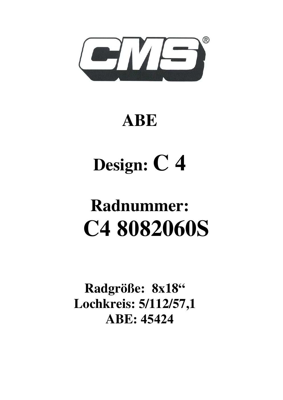 Dieses Gutachten (ABE) bezieht sich auf die Alufelge CMS C4 in der Ausführung ET 0, Mittenloch 0 mm (KBA 45424). Im PDF findest du typischerweise zulässige Reifengrößen, Auflagen/Anbauhinweise und – je nach Dokument – Hinweise zur Eintragung.