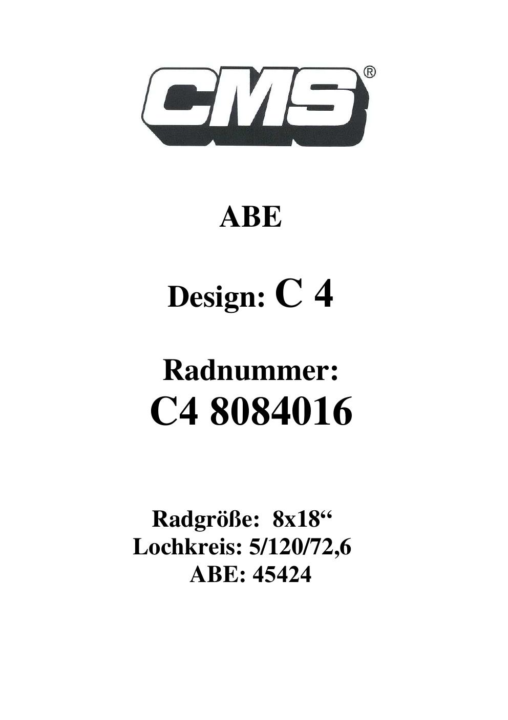 Dieses Gutachten (ABE) bezieht sich auf die Alufelge CMS C4 in der Ausführung ET 0, Mittenloch 0 mm (KBA 45424). Im PDF findest du typischerweise zulässige Reifengrößen, Auflagen/Anbauhinweise und – je nach Dokument – Hinweise zur Eintragung.