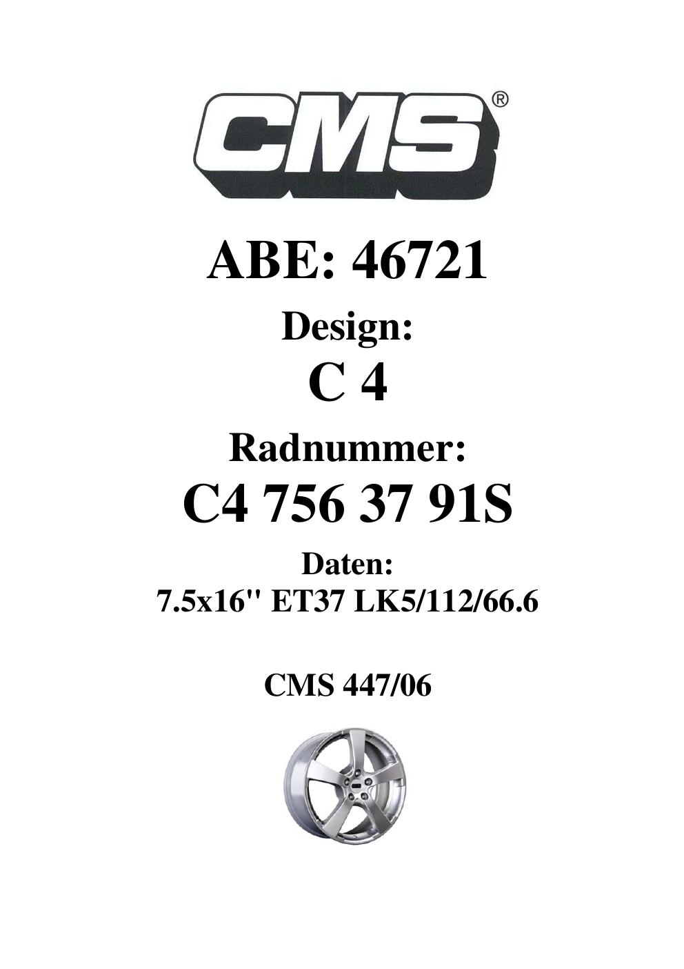 Dieses Gutachten (ABE) bezieht sich auf die Alufelge CMS C4 in der Ausführung 7.5Jx16 ET 0, Mittenloch 0 mm (KBA 46721). Im PDF findest du typischerweise zulässige Reifengrößen, Auflagen/Anbauhinweise und – je nach Dokument – Hinweise zur Eintragung.