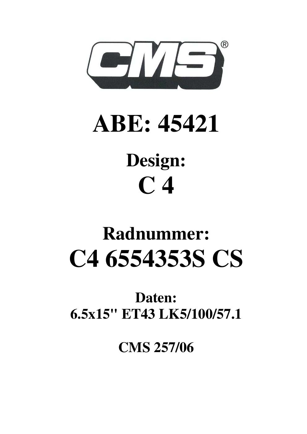 Felgengutachten / ABE für Alufelgen CMS C4 (6.5Jx15 ET 0, Mittenloch 0 mm) mit KBA 45421 (Zertifikatsnummer 45421). Hier kostenlos als PDF herunterladen. Der Download-Link ist 24 Stunden gültig und kann bis zu zwei Mal verwendet werden.