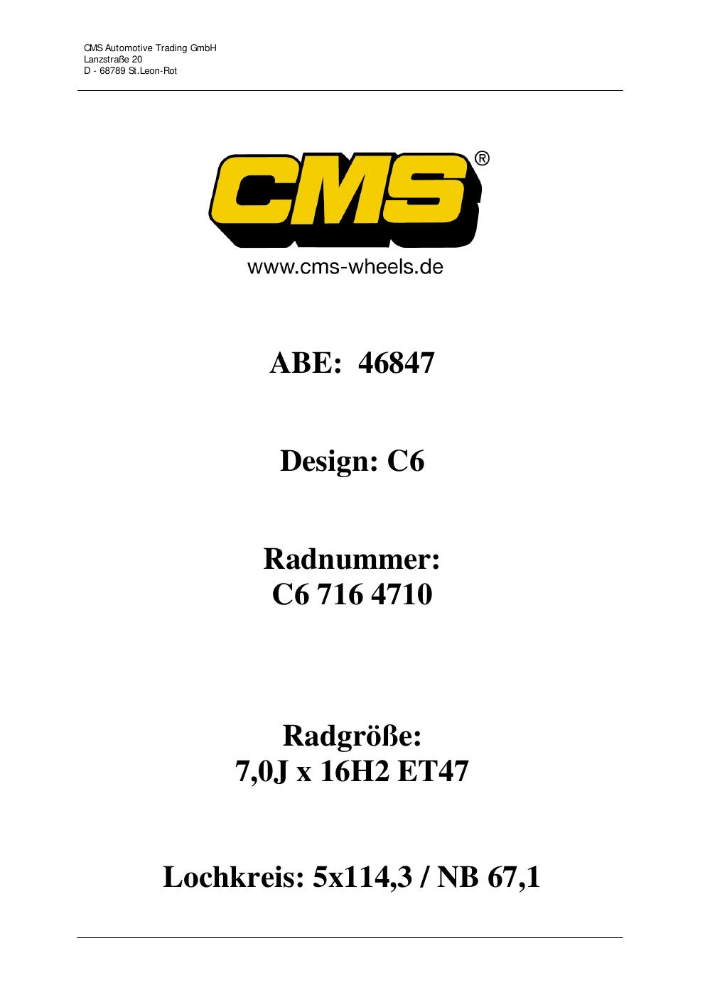 Dieses Gutachten (ABE) bezieht sich auf die Alufelge CMS C6 in der Ausführung ET 0, Mittenloch 0 mm (KBA 46847). Im PDF findest du typischerweise zulässige Reifengrößen, Auflagen/Anbauhinweise und – je nach Dokument – Hinweise zur Eintragung.