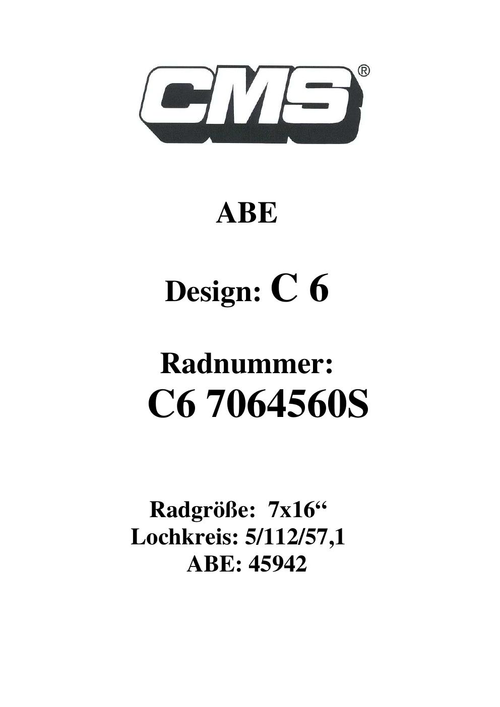Dieses Gutachten (ABE) bezieht sich auf die Alufelge CMS C6 in der Ausführung ET 0, Mittenloch 0 mm (KBA 45942). Im PDF findest du typischerweise zulässige Reifengrößen, Auflagen/Anbauhinweise und – je nach Dokument – Hinweise zur Eintragung.