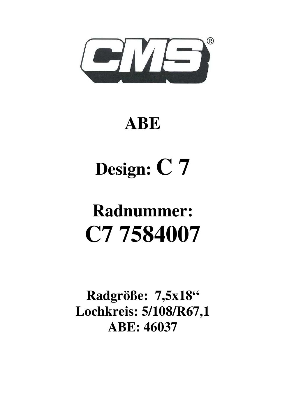 Dieses Gutachten (ABE) bezieht sich auf die Alufelge CMS C7 in der Ausführung ET 0, Mittenloch 0 mm (KBA 46037). Im PDF findest du typischerweise zulässige Reifengrößen, Auflagen/Anbauhinweise und – je nach Dokument – Hinweise zur Eintragung.