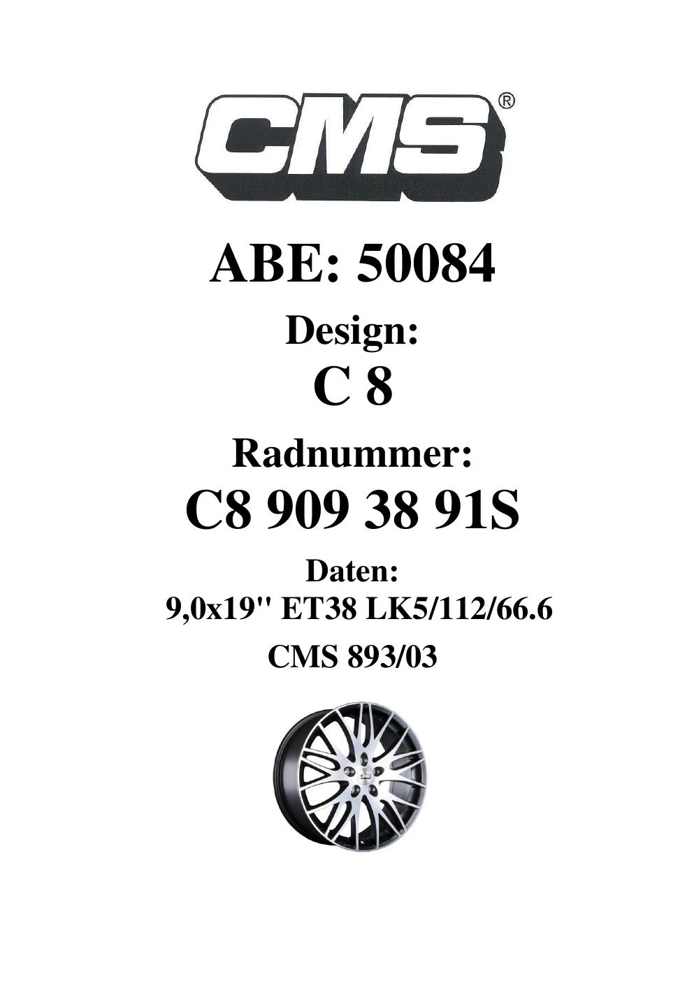 Felgengutachten / ABE für Alufelgen CMS C8 (9Jx19 ET 0, Mittenloch 0 mm) mit KBA 50084 (Zertifikatsnummer 50084). Hier kostenlos als PDF herunterladen. Der Download-Link ist 24 Stunden gültig und kann bis zu zwei Mal verwendet werden.