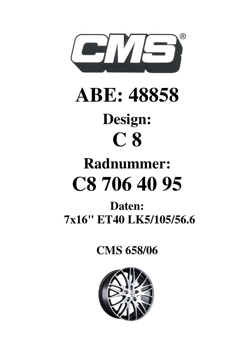 Dieses Gutachten (ABE) bezieht sich auf die Alufelge CMS C8 in der Ausführung 7Jx16 ET 0, Mittenloch 0 mm (KBA 48858). Im PDF findest du typischerweise zulässige Reifengrößen, Auflagen/Anbauhinweise und – je nach Dokument – Hinweise zur Eintragung.