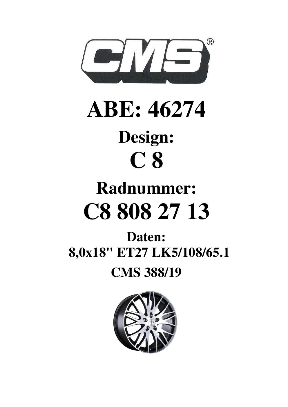 Dieses ABE gehört zur Felge CMS C8 in 8Jx18 ET0 mit KBA 46274. Die Seite ist dafür gedacht, dass du schnell prüfen kannst, ob KBA, Design und Größe zu deiner Felge passen und danach direkt das richtige PDF lädst.