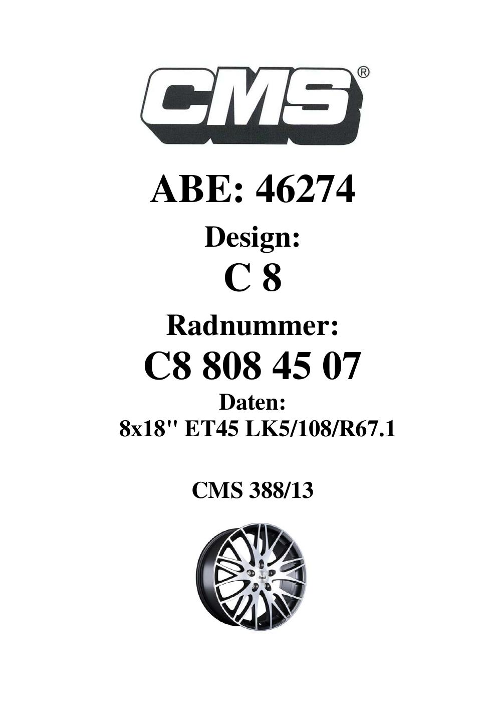 Dieses Gutachten (ABE) bezieht sich auf die Alufelge CMS C8 in der Ausführung 8Jx18 ET 0, Mittenloch 0 mm (KBA 46274). Im PDF findest du typischerweise zulässige Reifengrößen, Auflagen/Anbauhinweise und – je nach Dokument – Hinweise zur Eintragung.
