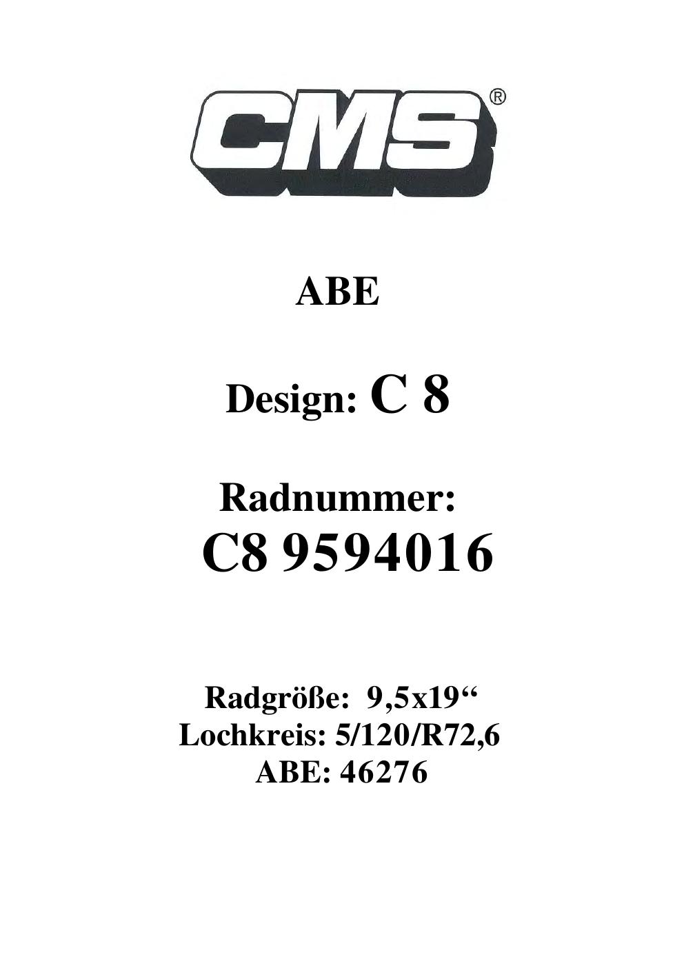 Dieses Gutachten (ABE) bezieht sich auf die Alufelge CMS C8 in der Ausführung ET 0, Mittenloch 0 mm (KBA 46276). Im PDF findest du typischerweise zulässige Reifengrößen, Auflagen/Anbauhinweise und – je nach Dokument – Hinweise zur Eintragung.