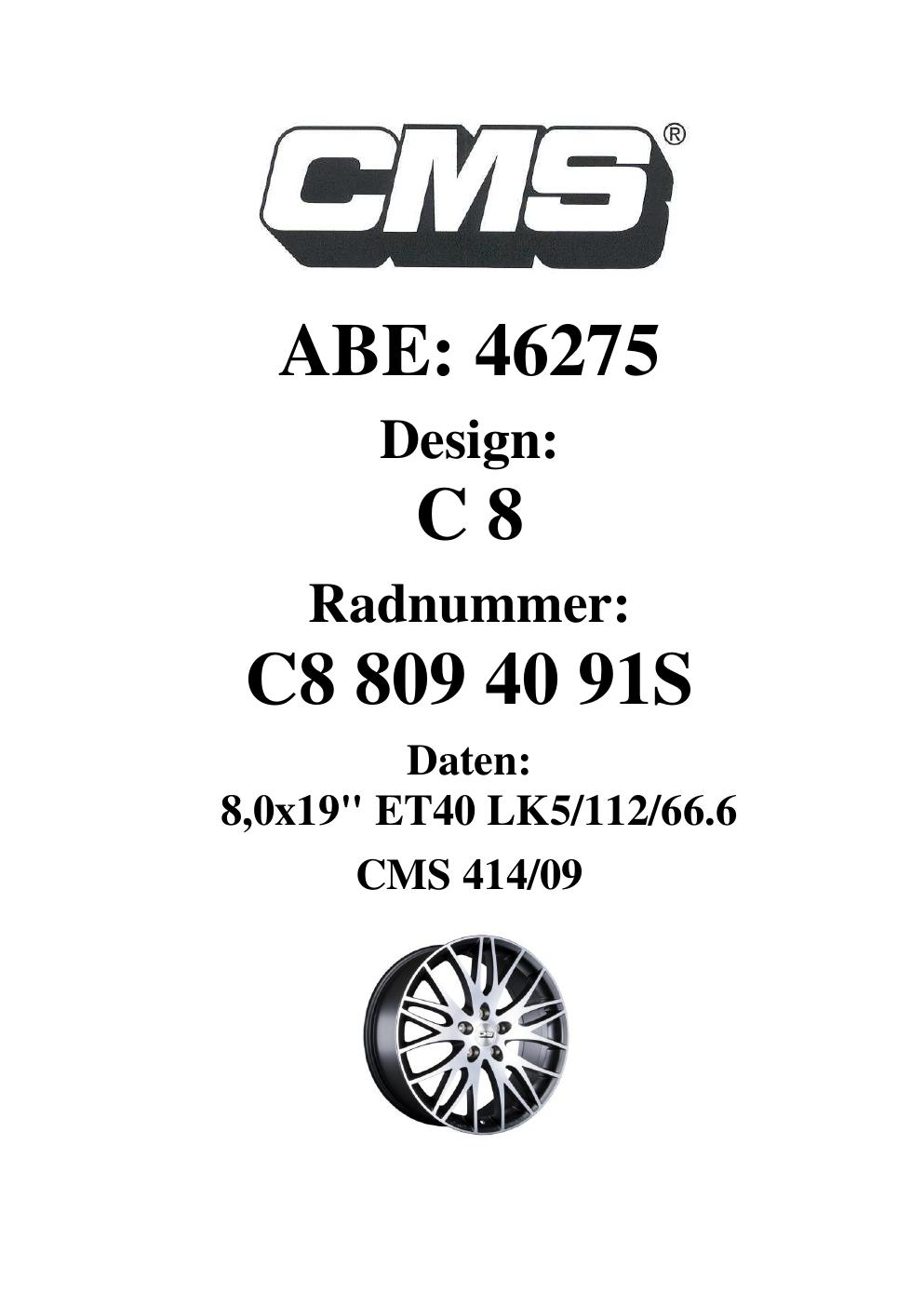 Dieses Gutachten (ABE) bezieht sich auf die Alufelge CMS C8 in der Ausführung 8Jx19 ET 0, Mittenloch 0 mm (KBA 46275). Im PDF findest du typischerweise zulässige Reifengrößen, Auflagen/Anbauhinweise und – je nach Dokument – Hinweise zur Eintragung.