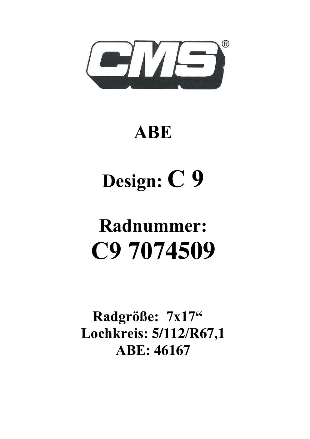 Dieses Gutachten (ABE) bezieht sich auf die Alufelge CMS C9 in der Ausführung ET 0, Mittenloch 0 mm (KBA 46167). Im PDF findest du typischerweise zulässige Reifengrößen, Auflagen/Anbauhinweise und – je nach Dokument – Hinweise zur Eintragung.