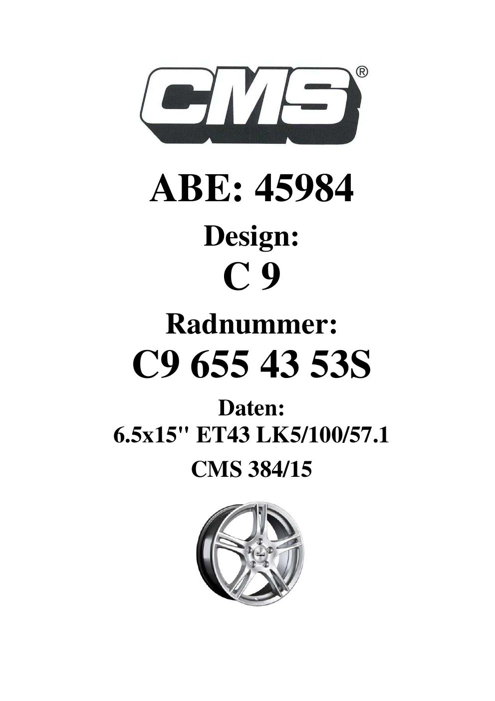 Dieses Gutachten (ABE) bezieht sich auf die Alufelge CMS C9 in der Ausführung 6.5Jx15 ET 0, Mittenloch 0 mm (KBA 45984). Im PDF findest du typischerweise zulässige Reifengrößen, Auflagen/Anbauhinweise und – je nach Dokument – Hinweise zur Eintragung.