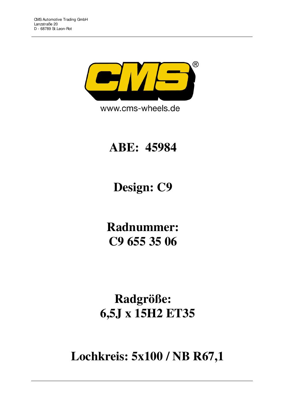 Dieses Gutachten (ABE) bezieht sich auf die Alufelge CMS C9 in der Ausführung ET 0, Mittenloch 0 mm (KBA 45984). Im PDF findest du typischerweise zulässige Reifengrößen, Auflagen/Anbauhinweise und – je nach Dokument – Hinweise zur Eintragung.