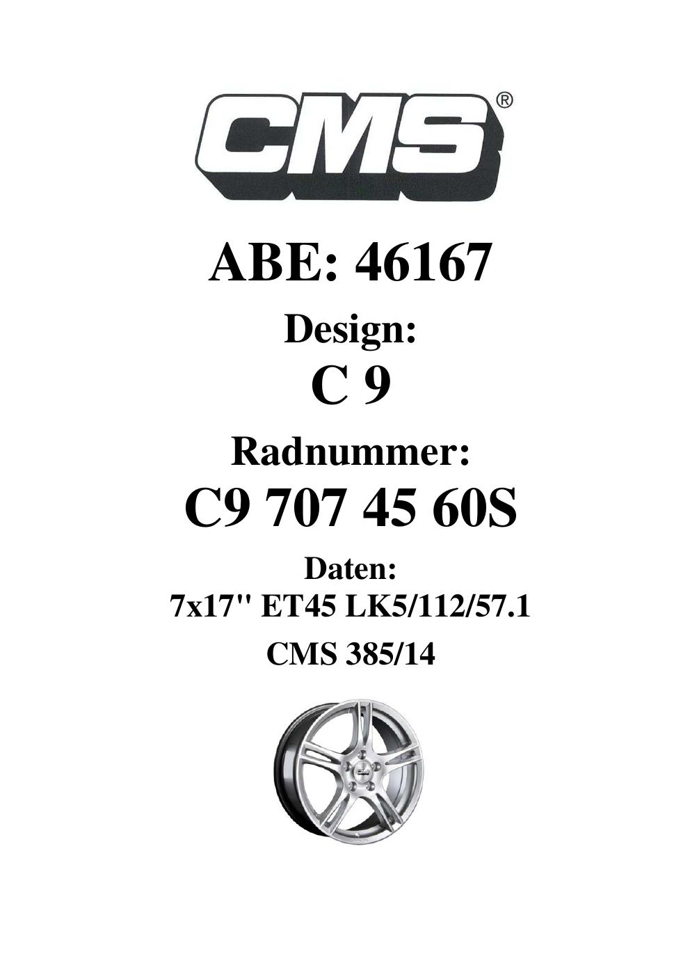 Dieses Gutachten (ABE) bezieht sich auf die Alufelge CMS C9 in der Ausführung 7Jx17 ET 0, Mittenloch 0 mm (KBA 46167). Im PDF findest du typischerweise zulässige Reifengrößen, Auflagen/Anbauhinweise und – je nach Dokument – Hinweise zur Eintragung.