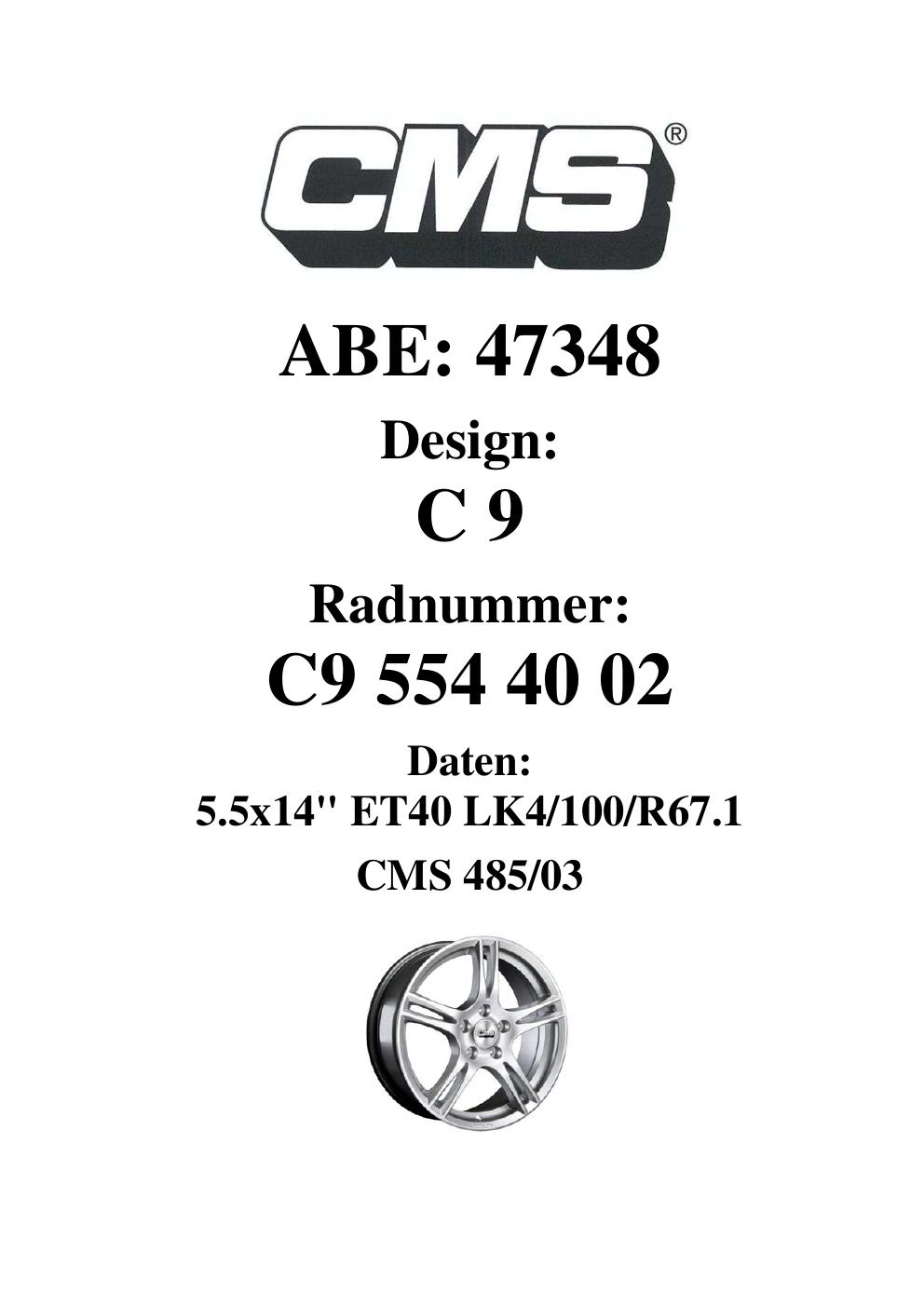 Dieses Gutachten (ABE) bezieht sich auf die Alufelge CMS C9 in der Ausführung 5.5Jx14 ET 0, Mittenloch 0 mm (KBA 47348). Im PDF findest du typischerweise zulässige Reifengrößen, Auflagen/Anbauhinweise und – je nach Dokument – Hinweise zur Eintragung.