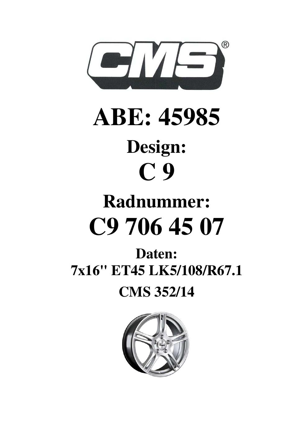 Dieses Gutachten (ABE) bezieht sich auf die Alufelge CMS C9 in der Ausführung 7Jx16 ET 0, Mittenloch 0 mm (KBA 45985). Im PDF findest du typischerweise zulässige Reifengrößen, Auflagen/Anbauhinweise und – je nach Dokument – Hinweise zur Eintragung.