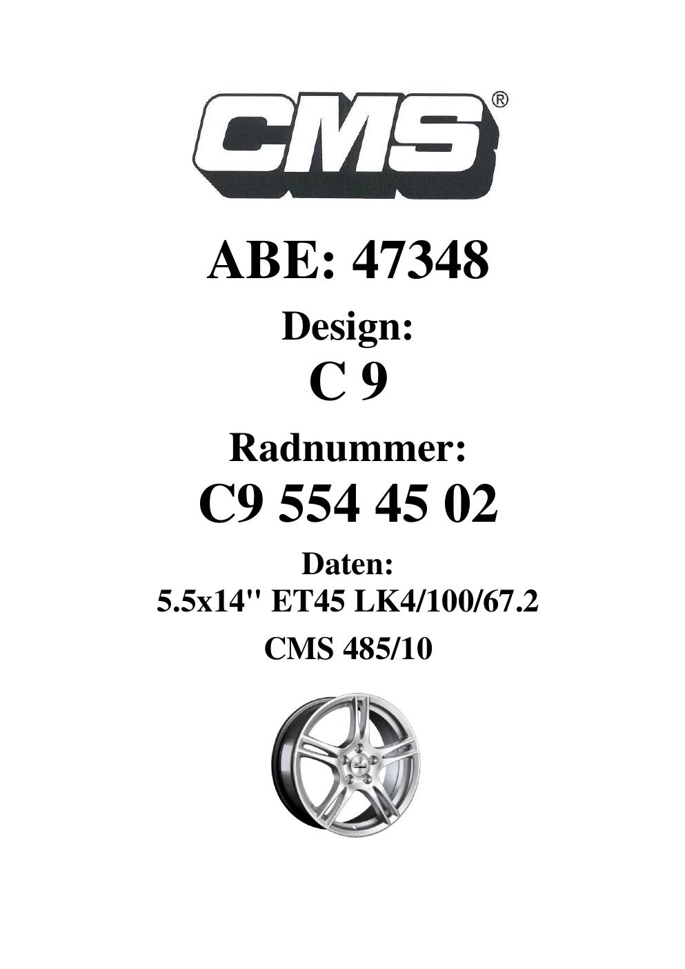 Dieses Gutachten (ABE) bezieht sich auf die Alufelge CMS C9 in der Ausführung 5.5Jx14 ET 0, Mittenloch 0 mm (KBA 47348). Im PDF findest du typischerweise zulässige Reifengrößen, Auflagen/Anbauhinweise und – je nach Dokument – Hinweise zur Eintragung.