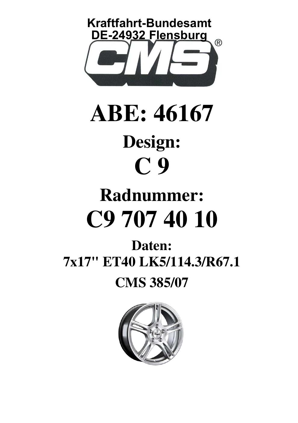 Dieses Gutachten (ABE) bezieht sich auf die Alufelge CMS C9 in der Ausführung 7Jx17 ET 0, Mittenloch 0 mm (KBA 46167). Im PDF findest du typischerweise zulässige Reifengrößen, Auflagen/Anbauhinweise und – je nach Dokument – Hinweise zur Eintragung.