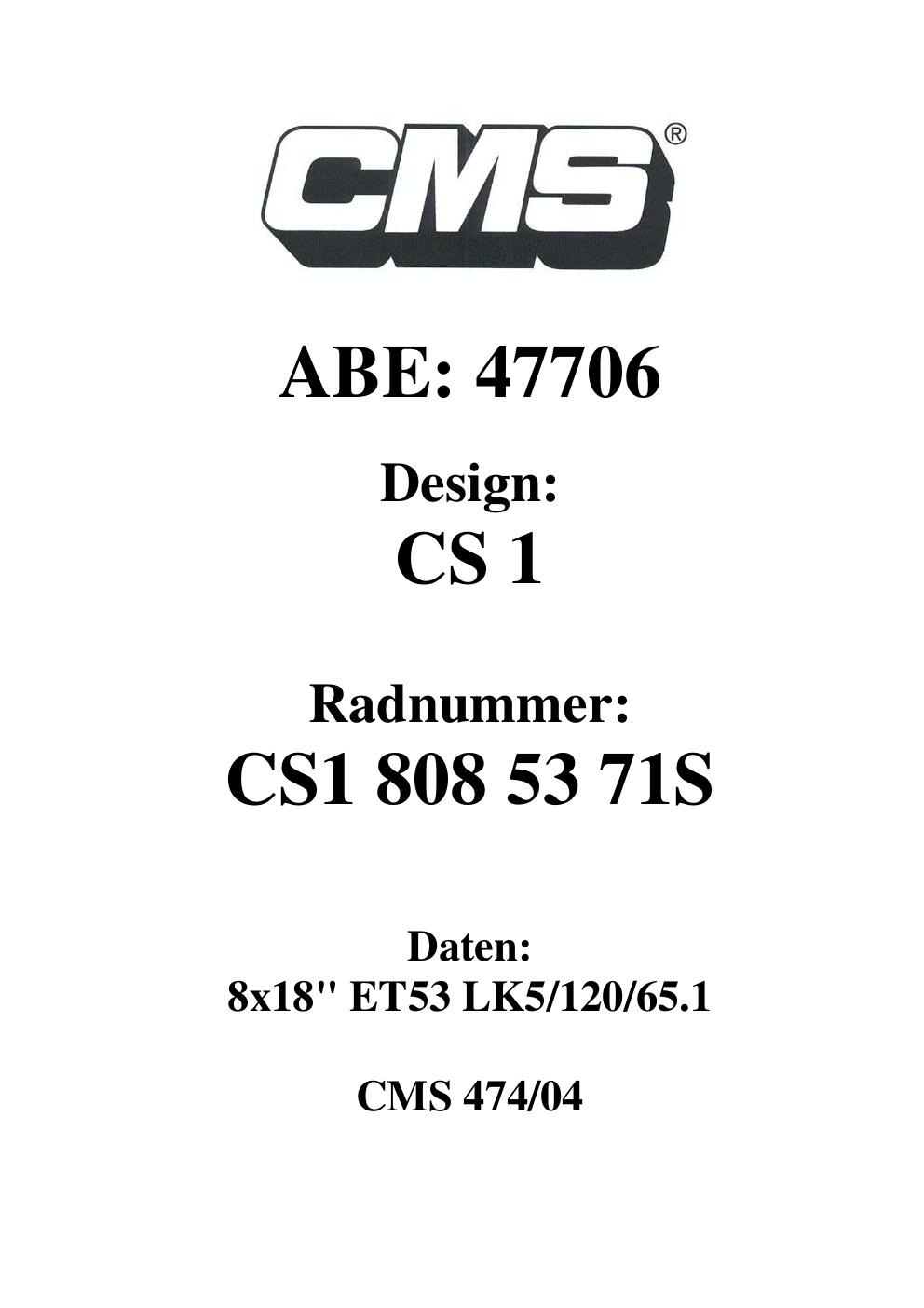 Dieses Gutachten (ABE) bezieht sich auf die Alufelge CMS CS1 in der Ausführung 8Jx18 ET 0, Mittenloch 0 mm (KBA 47706). Im PDF findest du typischerweise zulässige Reifengrößen, Auflagen/Anbauhinweise und – je nach Dokument – Hinweise zur Eintragung.