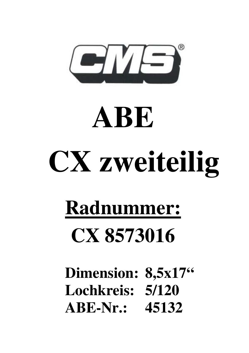 Dieses Gutachten (ABE) bezieht sich auf die Alufelge CMS UNKNOWN in der Ausführung ET 0, Mittenloch 0 mm (KBA 45132). Im PDF findest du typischerweise zulässige Reifengrößen, Auflagen/Anbauhinweise und – je nach Dokument – Hinweise zur Eintragung.