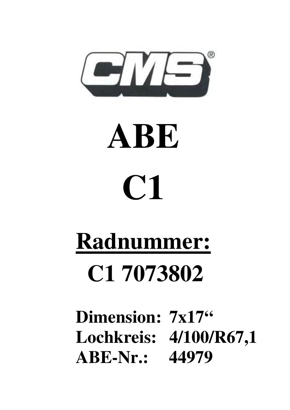 Dieses Gutachten (ABE) bezieht sich auf die Alufelge CMS UNKNOWN in der Ausführung ET 0, Mittenloch 0 mm (KBA 44979). Im PDF findest du typischerweise zulässige Reifengrößen, Auflagen/Anbauhinweise und – je nach Dokument – Hinweise zur Eintragung.