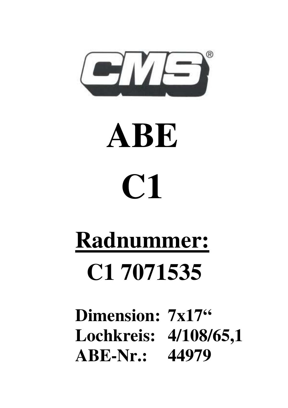Dieses Gutachten (ABE) bezieht sich auf die Alufelge CMS UNKNOWN in der Ausführung ET 0, Mittenloch 0 mm (KBA 44979). Im PDF findest du typischerweise zulässige Reifengrößen, Auflagen/Anbauhinweise und – je nach Dokument – Hinweise zur Eintragung.