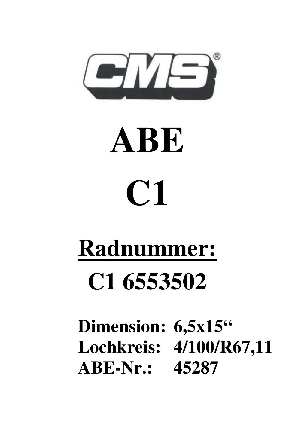 Dieses Gutachten (ABE) bezieht sich auf die Alufelge CMS UNKNOWN in der Ausführung ET 0, Mittenloch 0 mm (KBA 45287). Im PDF findest du typischerweise zulässige Reifengrößen, Auflagen/Anbauhinweise und – je nach Dokument – Hinweise zur Eintragung.