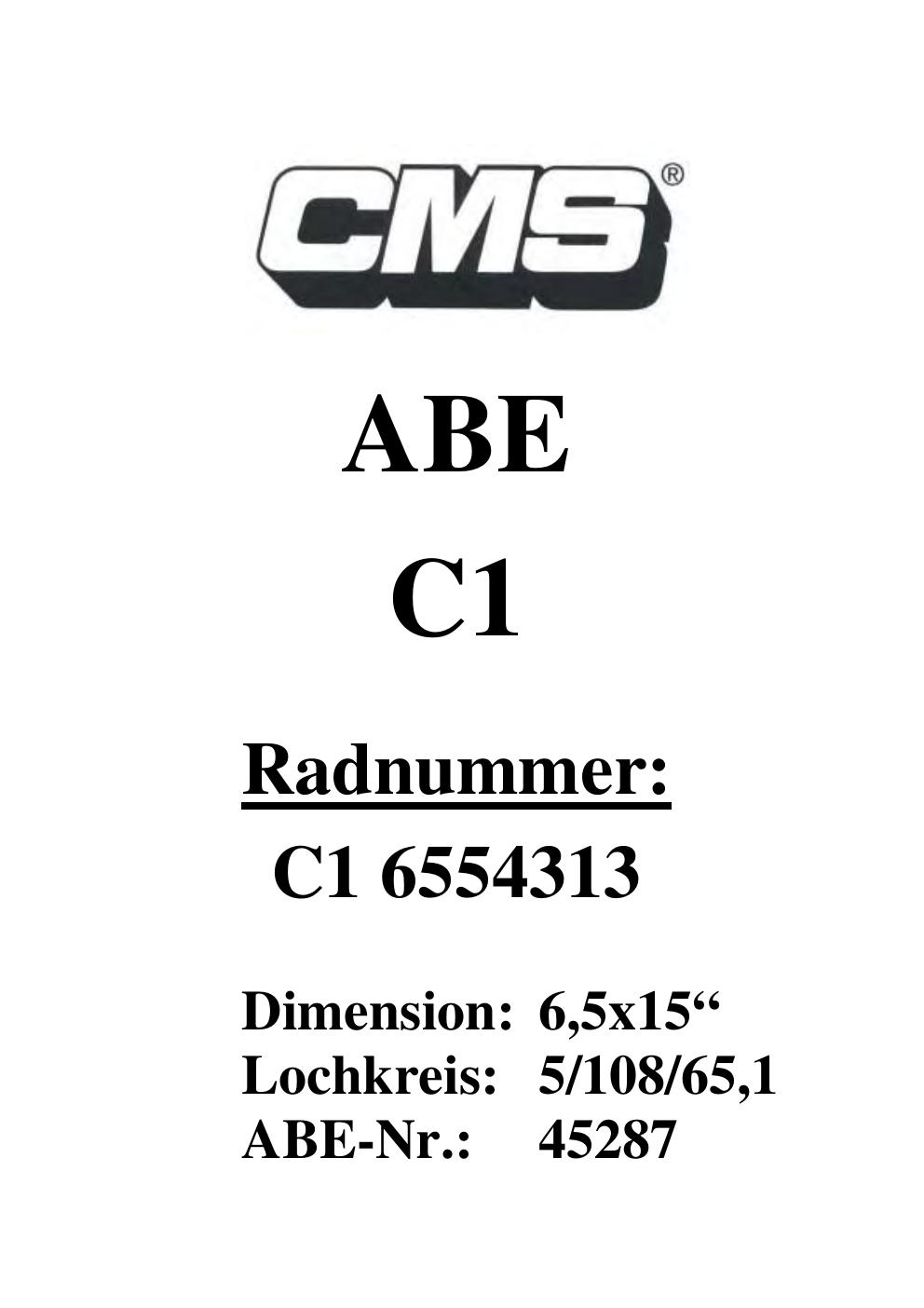 Dieses Gutachten (ABE) bezieht sich auf die Alufelge CMS UNKNOWN in der Ausführung ET 0, Mittenloch 0 mm (KBA 45287). Im PDF findest du typischerweise zulässige Reifengrößen, Auflagen/Anbauhinweise und – je nach Dokument – Hinweise zur Eintragung.