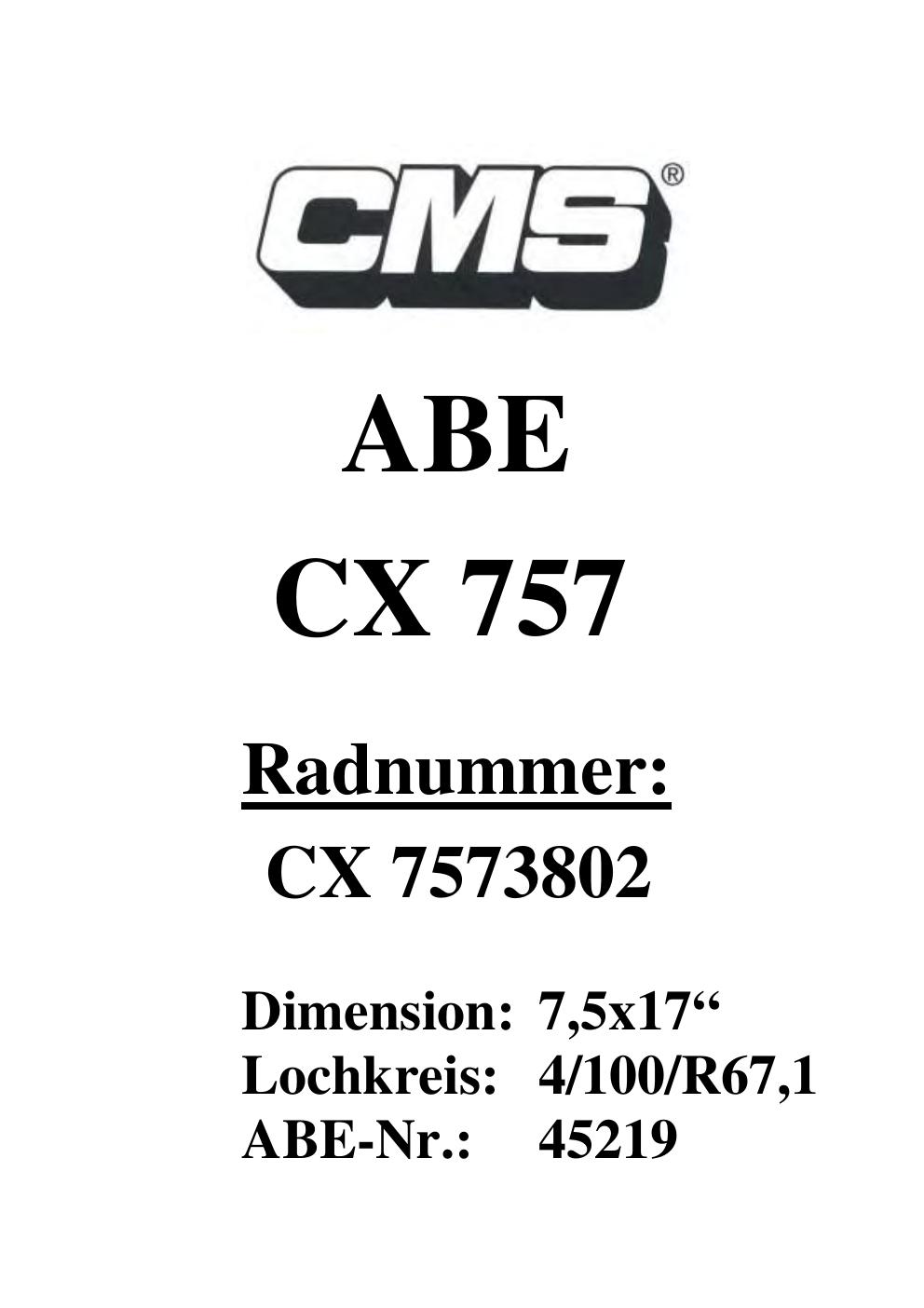 Dieses Gutachten (ABE) bezieht sich auf die Alufelge CMS UNKNOWN in der Ausführung ET 0, Mittenloch 0 mm (KBA 45219). Im PDF findest du typischerweise zulässige Reifengrößen, Auflagen/Anbauhinweise und – je nach Dokument – Hinweise zur Eintragung.