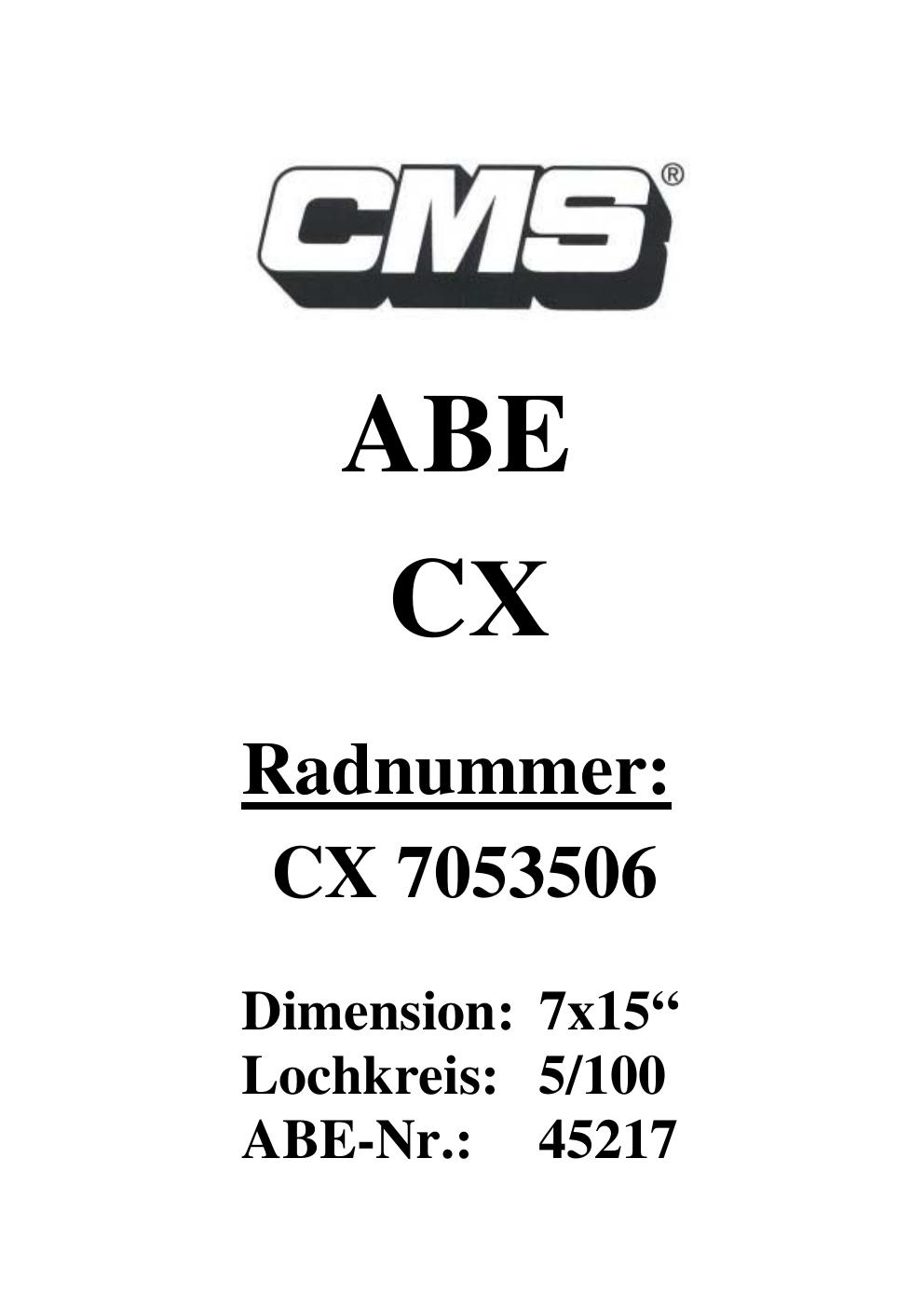 Dieses Gutachten (ABE) bezieht sich auf die Alufelge CMS UNKNOWN in der Ausführung ET 0, Mittenloch 0 mm (KBA 45217). Im PDF findest du typischerweise zulässige Reifengrößen, Auflagen/Anbauhinweise und – je nach Dokument – Hinweise zur Eintragung.
