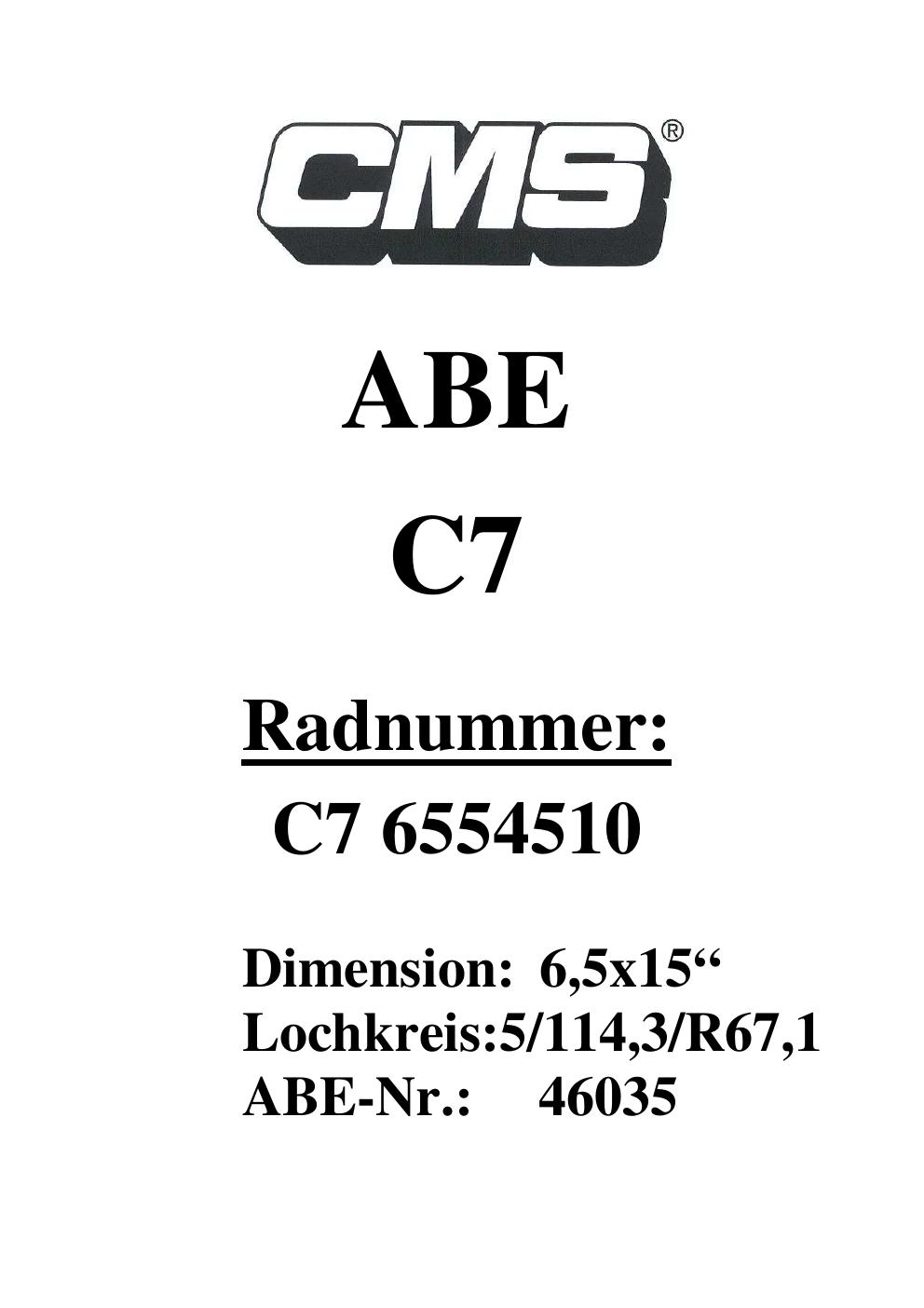 Dieses Gutachten (ABE) bezieht sich auf die Alufelge CMS UNKNOWN in der Ausführung ET 0, Mittenloch 0 mm (KBA 46035). Im PDF findest du typischerweise zulässige Reifengrößen, Auflagen/Anbauhinweise und – je nach Dokument – Hinweise zur Eintragung.