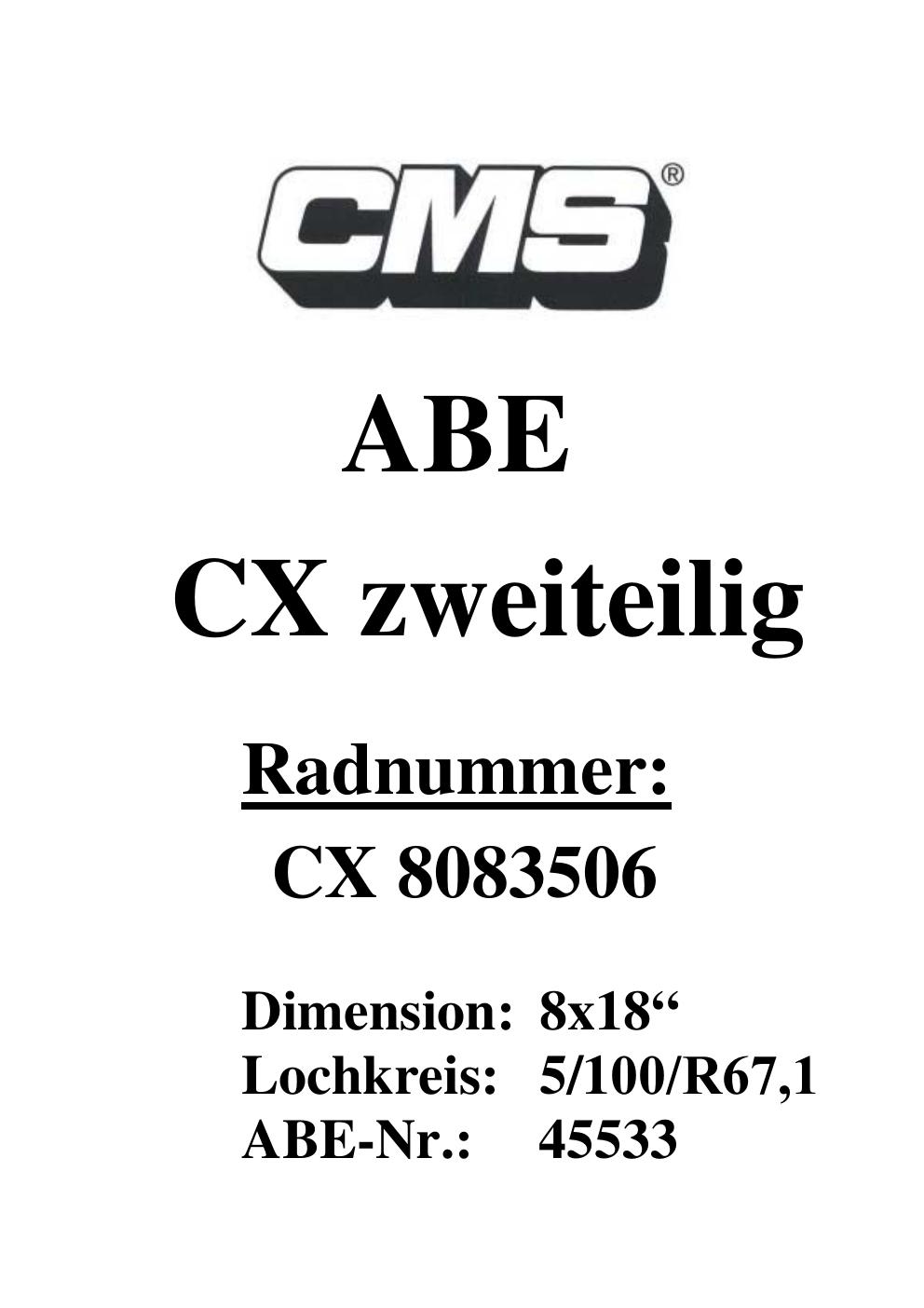 Dieses ABE gehört zur Felge CMS V1 in ET0 mit KBA 45533. Die Seite ist dafür gedacht, dass du schnell prüfen kannst, ob KBA, Design und Größe zu deiner Felge passen und danach direkt das richtige PDF lädst.