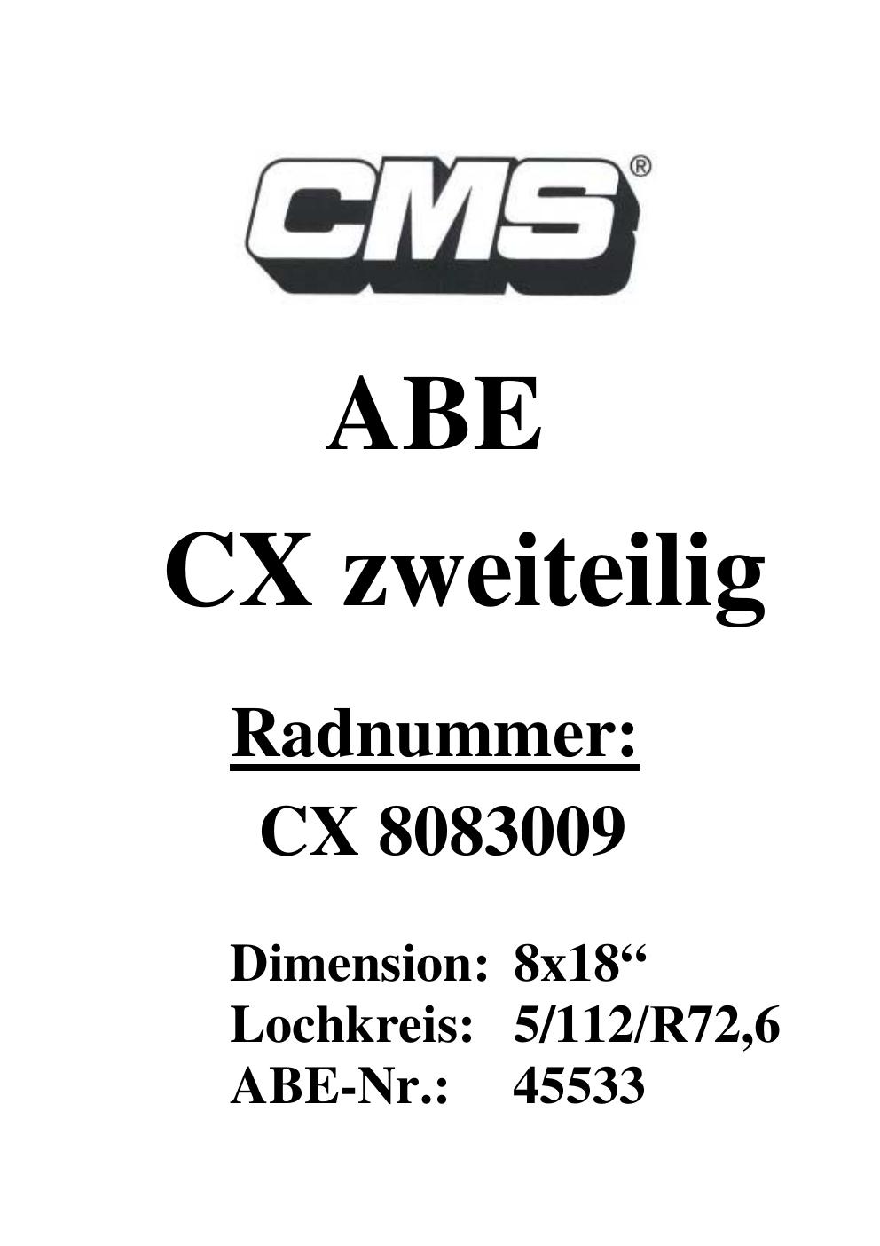 Dieses Gutachten (ABE) bezieht sich auf die Alufelge CMS UNKNOWN in der Ausführung ET 0, Mittenloch 0 mm (KBA 45533). Im PDF findest du typischerweise zulässige Reifengrößen, Auflagen/Anbauhinweise und – je nach Dokument – Hinweise zur Eintragung.