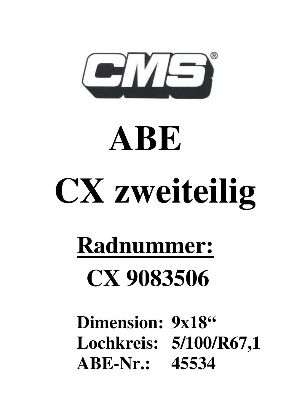 Dieses Gutachten (ABE) bezieht sich auf die Alufelge CMS UNKNOWN in der Ausführung ET 0, Mittenloch 0 mm (KBA 45534). Im PDF findest du typischerweise zulässige Reifengrößen, Auflagen/Anbauhinweise und – je nach Dokument – Hinweise zur Eintragung.
