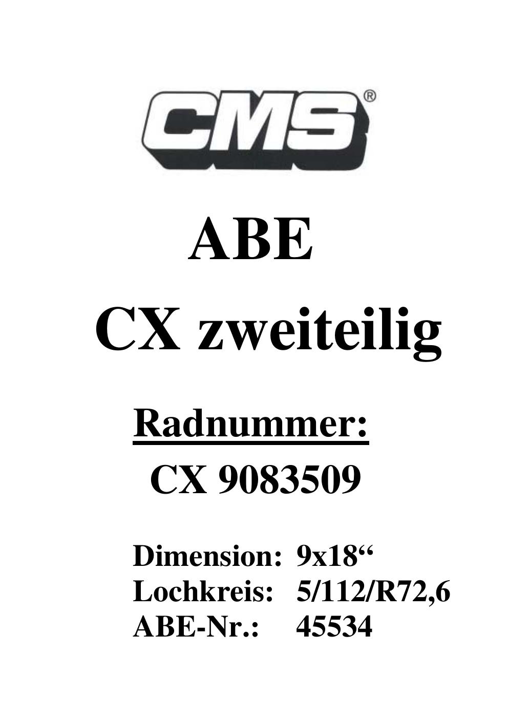 Dieses Gutachten (ABE) bezieht sich auf die Alufelge CMS UNKNOWN in der Ausführung ET 0, Mittenloch 0 mm (KBA 45534). Im PDF findest du typischerweise zulässige Reifengrößen, Auflagen/Anbauhinweise und – je nach Dokument – Hinweise zur Eintragung.